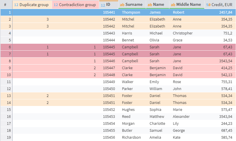 - Duplicates and contradictions. Records that belong to two categories simultaneously. The ordinal numbers of the groups may not match. These records are highlighted in brighter pink.