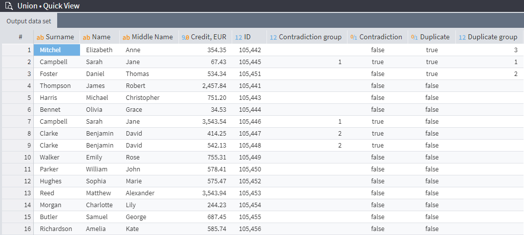 On activation, the node will check each source data record for duplicates or contradictions. The node's output will list all inconsistencies and duplicates in a table.