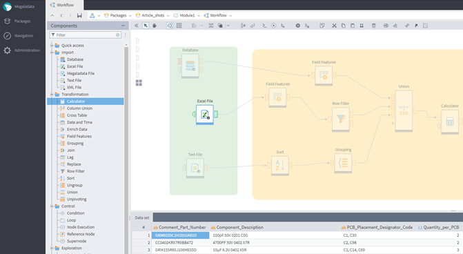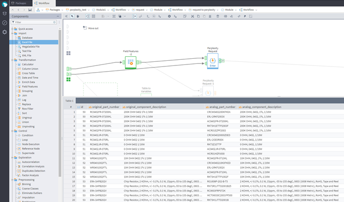 - Data preparation: The data can then be preprocessed according to your needs, such as being joined, aggregated, or sorted. At this stage, the LLM AI Module is employed to analyze the BOM and determine the key characteristics of each component. With AI assistance, preparing the list of orders becomes significantly faster.